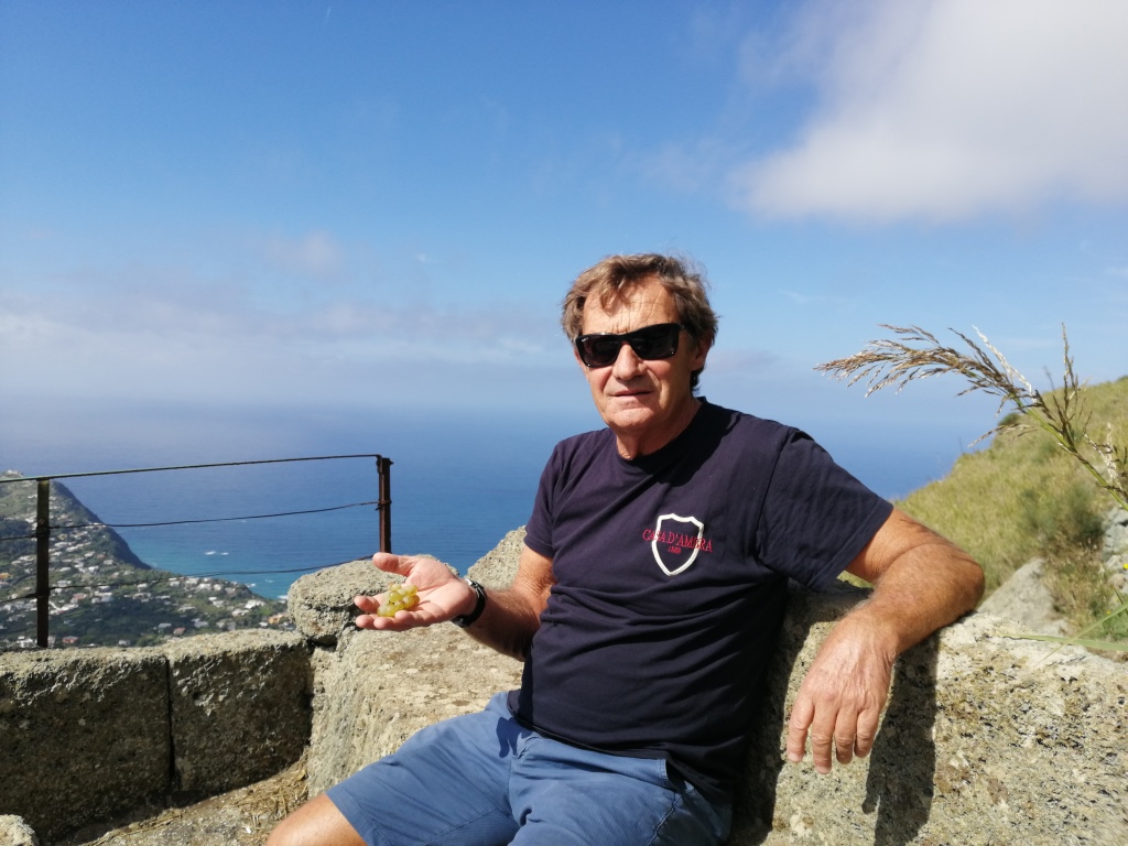 A Luigi Veronelli il vigneto dei Frassitelli regalava un’ebrezza speciale, da lassù quasi in cima al Monte Epomeo, che è la montagna sacra da cui tutto si vede e domina l’isola e il golfo di Napoli fino alle coste laziali.